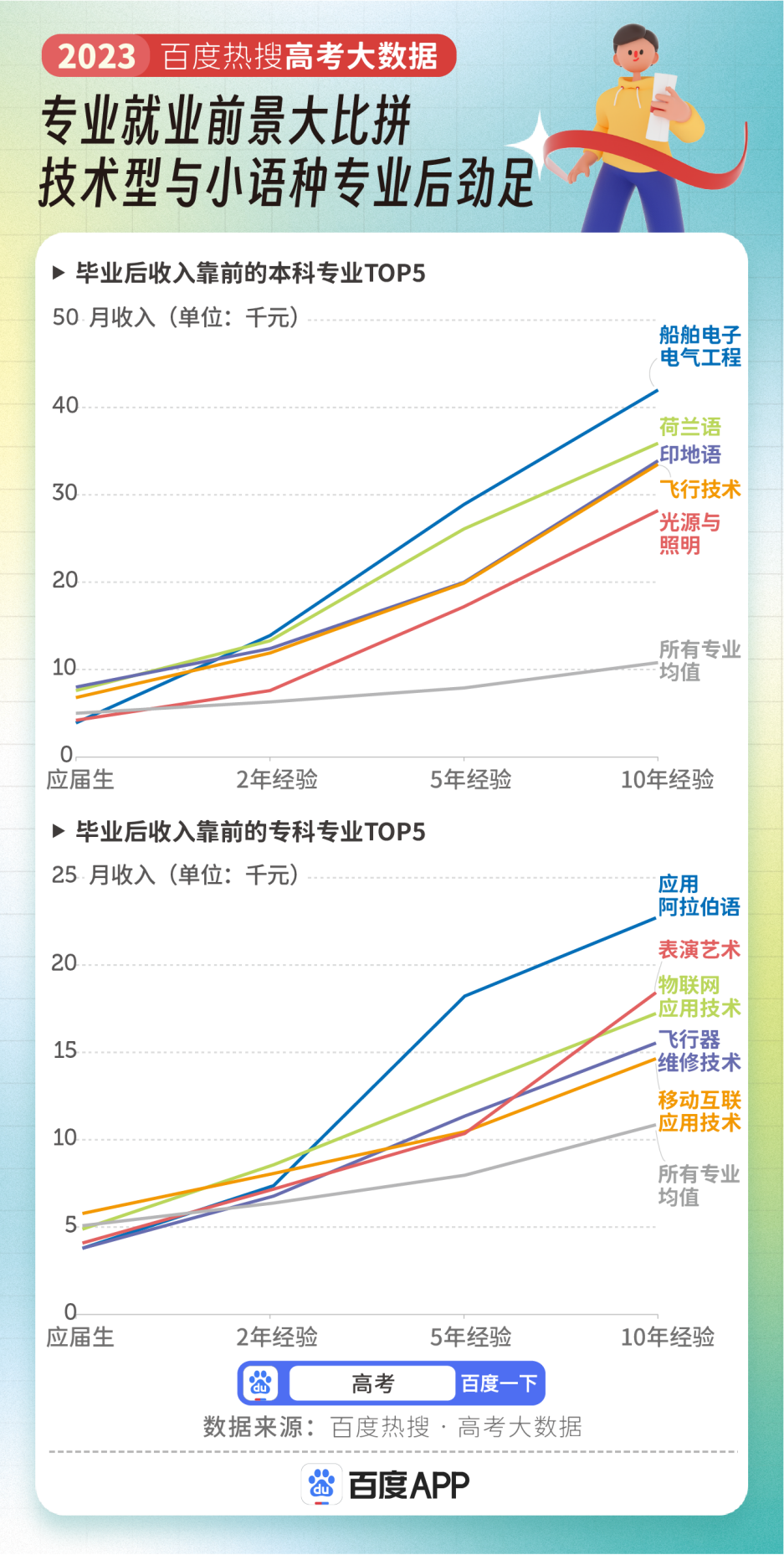 着眼于未来,大数据还整理了就业“钱”景最佳的专业。船舶电子电气工程、荷兰语、印地语、飞行技术、光源与照明位列就业前景最佳本科专业前五。数据显示,如上专业的毕业生在对口领域的收入,将随着就业年限的增长与其他专业毕业生拉开大幅差距。