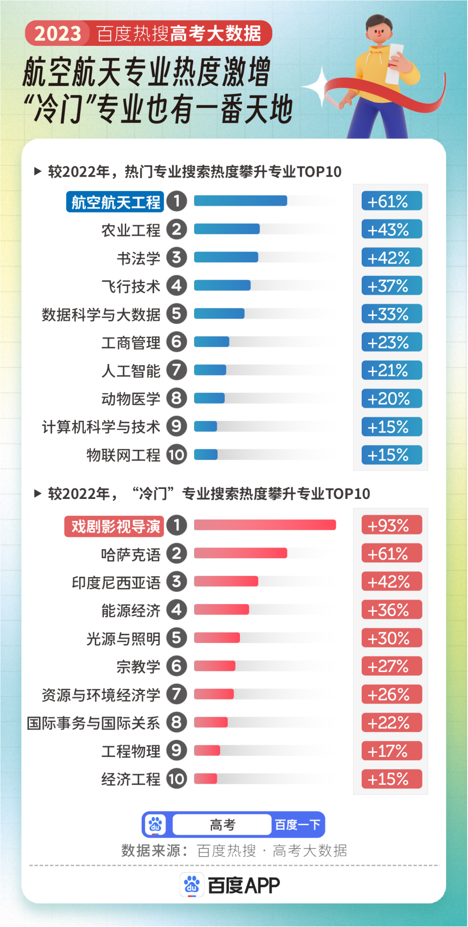 与往年相比,航空航天工程增长最多,高达61%。另外,农业工程、数据科学与大数据技术等热门专业仍然保持强劲势头,搜索热度继续攀升。